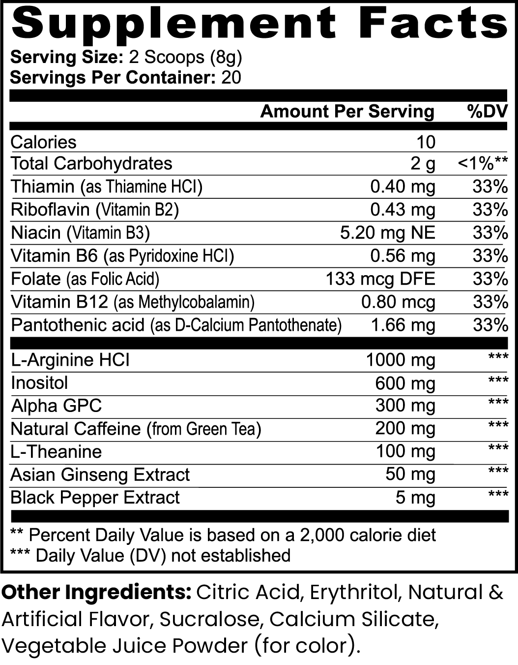 Ingredients: L-Arginine HCl, Inositol, Alpha-GPC, Natural Caffeine (from Green Tea), L-Theanine, Asian Ginseng Extract, Black Pepper Extract, Thiamin (as Thiamine HCl), Riboflavin (Vitamin B2), Niacin (Vitamin B3), Vitamin B6 (as Pyridoxine HCl), Folate (as Folic Acid), Vitamin B12 (as Methylcobalamin), Pantothenic Acid (as D-Calcium Pantothenate), Citric Acid, Erythritol, Natural & Artificial Flavor, Sucralose, Calcium Silicate, Vegetable Juice Powder (for color).